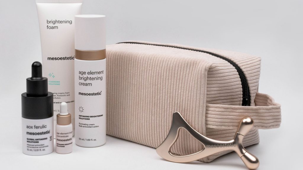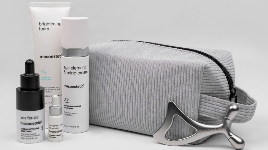 Chaque coffret associe une routine complète, inspirée des protocoles mesoestetic® pour répondre aux besoins de chaque type de peau et chaque étape du vieillissement cutané. Une expérience sensorielle complète : le nettoyant visage brightening foam, le sérum anti-âge aox ferulic, le mini-sérum ainsi que la crème de jour age element® adaptés au stade du vieillissement cutané ; ainsi que deux cadeaux exclusifs : la trousse de beauté et un accessoire de massage pour le visage.