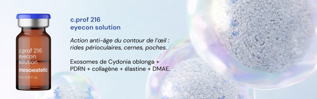 Exosomes de Curcuma longa + PDRN + acide tranexamique + vitamine K1 + rutine. Indications : rides périoculaires, cernes vasculaires et pigmentés, poches.