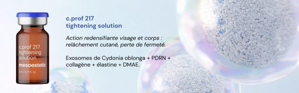 Exosomes de Cydonia oblonga + PDRN + collagène + élastine + DMAE. Indications : relâchement cutané, perte de fermeté.