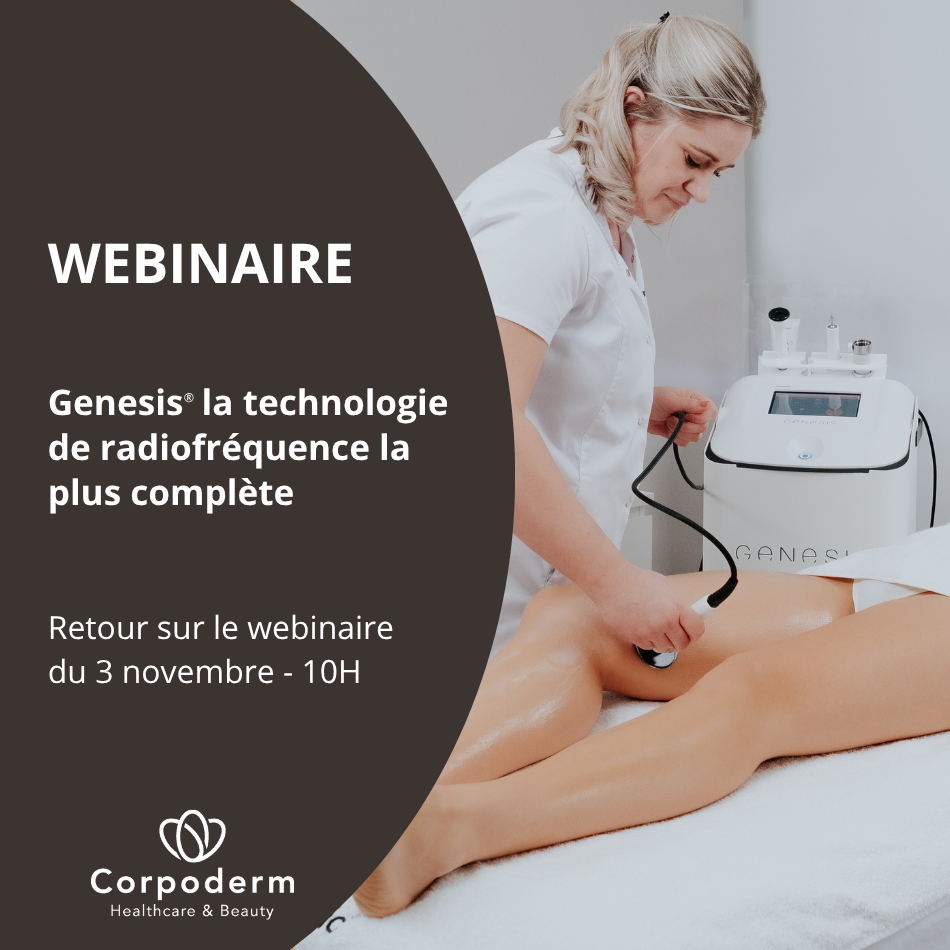 Le 3 novembre dernier, vous avez pu assister au webinaire Genesis®, la technologie de radiofréquence associée à l’électrophoroporation, signée mesoestetic®. Présentée par Sandrine, formatrice chez Corpoderm, cette session riche en contenus techniques et protocoles combinés avec les produits mesoestetic® avait pour but d’explorer le potentiel de cette technologie pour votre centre esthétique, aussi bien pour le visage que pour la silhouette.